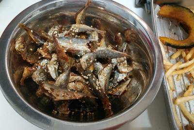 カラッと揚げた豆アジの唐揚げ。 いくらでも食べられそうな美味しさ。 頭から尻尾まで食べられるのも魅力です。 レモンを絞って召し上がれ。 「豆アジ」はアジの稚魚、小さくて若いアジです。 頭から尻尾の先まで測って、7、8センチ程度。 豆アジのさばき方 豆アジの処理は比較的簡単です。 口当たりが気になるようでしたら、ぜいごを取ります。 骨ごと食べる料理ですので、ぜいごは取っても取らなくても構いません。 次にエラとカマ骨と内臓を手で引っ張ってはずします。 はずさない方 続いて基本的な食べ方を見ていきましょう。 豆アジを「丸揚げ」にして頭から食べる 丸揚げは10センチ以下ぐらいの「豆アジ」サイズにぴったりの食べ方です。 下処理したアジに小麦粉か片栗粉をまぶして油で揚げるだけ。 中はホクホク外はサクサク。
